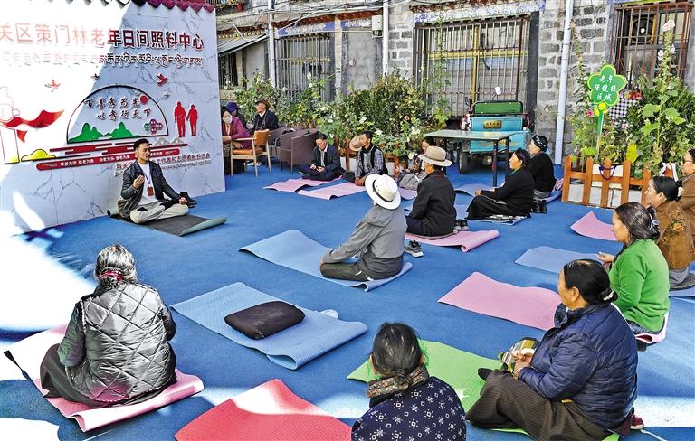 图为拉萨市城关区策门林老年日间照料中心举办培训,教老人们练习瑜伽。 记者 旦增兰泽 摄