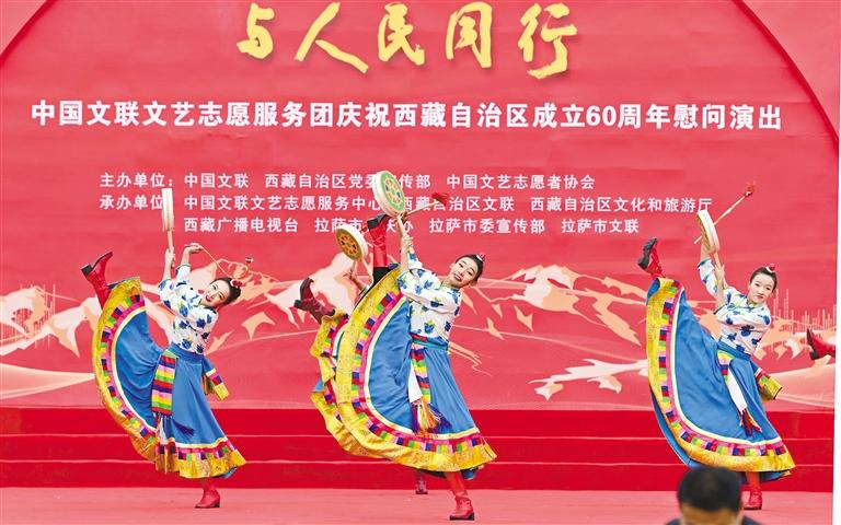 5月23日,在中国文艺志愿者服务日到来之际,由中国文联、西藏自治区党委宣传部、中国文艺志愿者协会共同主办的“与人民同行”慰问演出在西藏会展中心广场隆重举行。这场庆祝西藏自治区成立60周年的文艺盛宴,在歌舞《鼓舞西藏》激昂的节奏中拉开帷幕。
