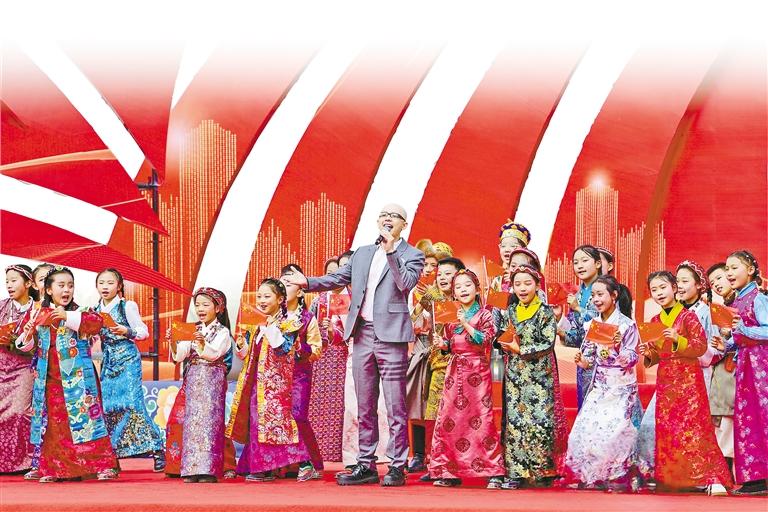 歌手平安与西藏珠峰少年合唱团带来歌曲《我爱你中国》。 (其余图片均由记者 唐斌 白玛泽旺 王敏 丹增群培 旦增兰泽 摄)