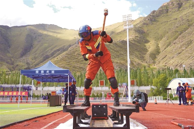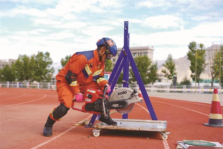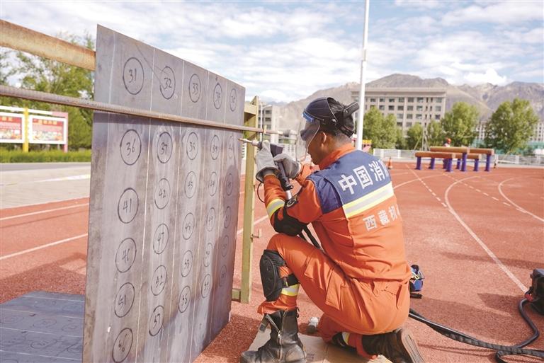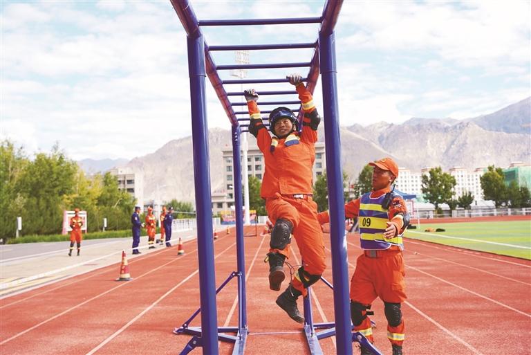 “我们将严守比武规则,守牢安全底线,以勇于拼搏、敢打必胜的决心,团结协作、精诚配合,在比武场上尽情展示平日苦练的专业技能,绽放‘火焰蓝’青春的耀眼光芒,为守护人民生命财产安全和生态环境安全筑牢坚实防线。”西藏森林消防总队政治教导员杨秀君说。图/记者 贡曲罗杰