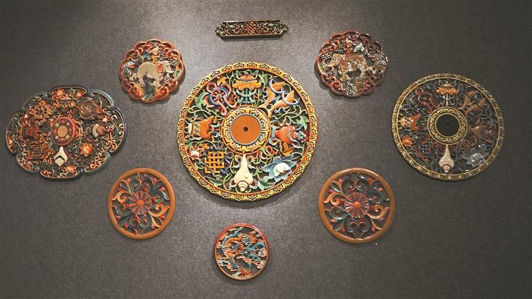 2024年,市民参观“雪域彩韵——藏式木雕彩绘精粹展”暨西藏职业技术学院50周年校庆教学成果展。