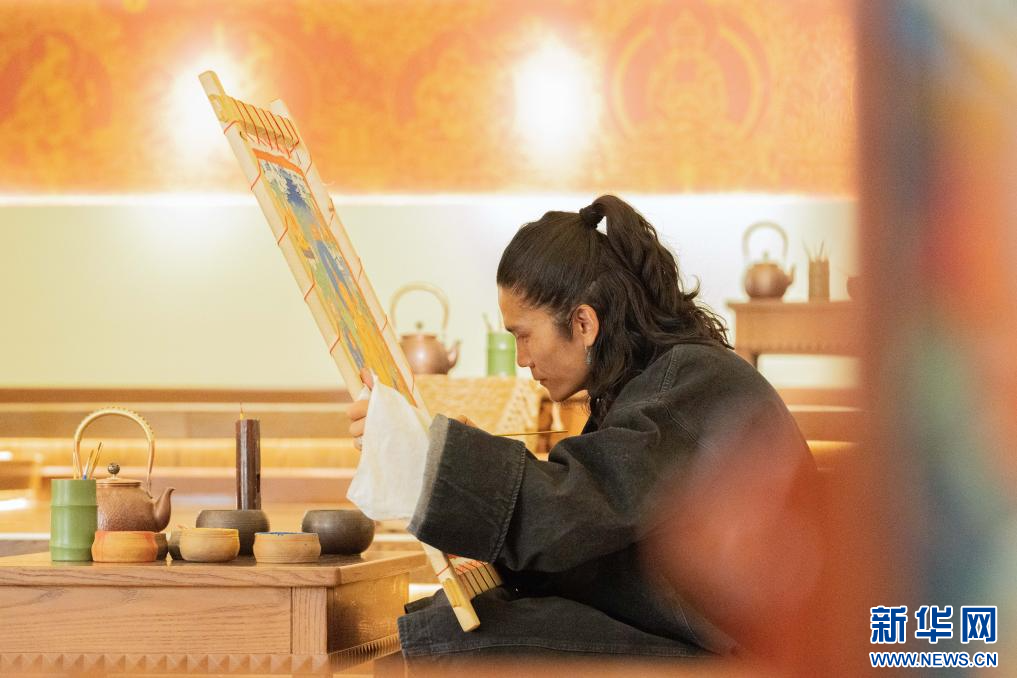 勉唐派唐卡非遗传承人白玛索朗在非遗实训基地画唐卡。新华网 旦增努布 摄