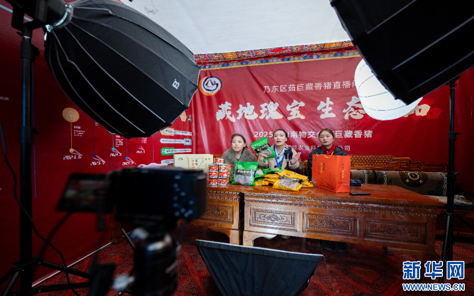 12月1日,一位助农主播(右二)在第45届雅砻物资交流会电商直播一条街上介绍产品。新华网 旦增努布 摄