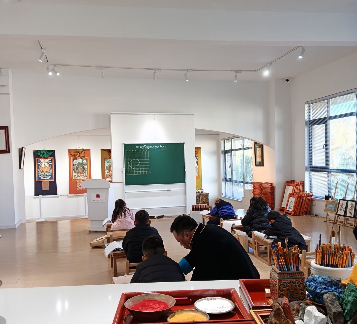 午后,体验馆又迎来新的访客。顿珠穿梭其间,轻声指导握笔,讲解颜料特性。学徒们则在辅助教学的过程中,深化着自己对唐卡的理解。“在这里教别人,反而让我对唐卡懂得更深了。”体验馆画师群培笑着告诉记者,“向各地体验者讲解,连我的普通话都进步了。”