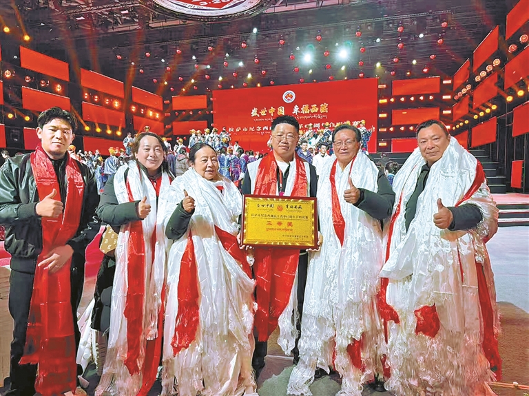 “盛世中国·幸福西藏”合唱比赛中,由向阳花(左三)指导的当雄代表队荣获二等奖。