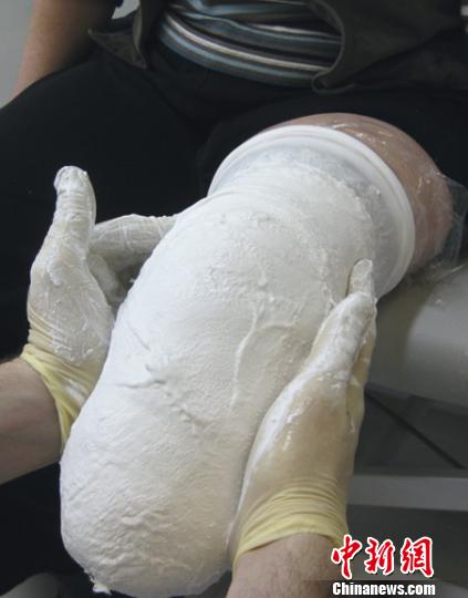 工作人员在截肢者的残肢末端用石膏绷带取型。 中国康复研究中心供图