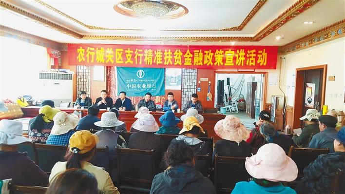 农行城关区支行在纳金乡为农牧民宣讲金融扶贫政策和扶贫产品。