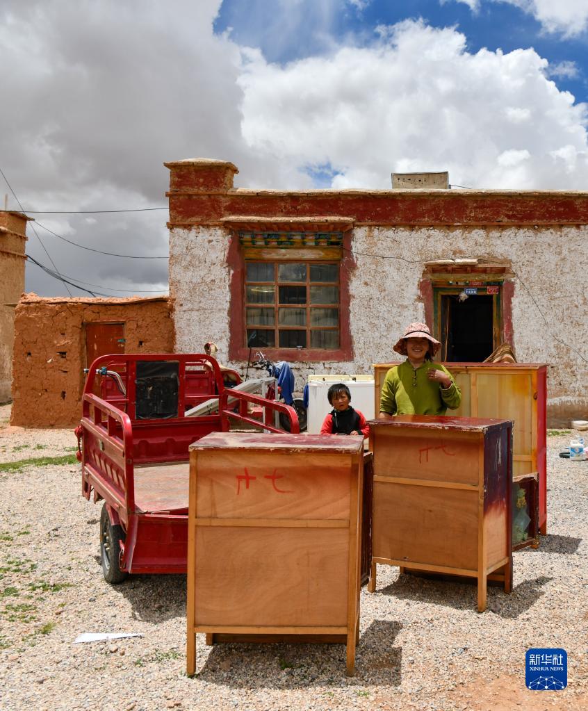 双湖县多玛乡果根擦曲村村民在打包家具,准备搬迁(7月12日摄)。新华社记者 周荻潇 摄