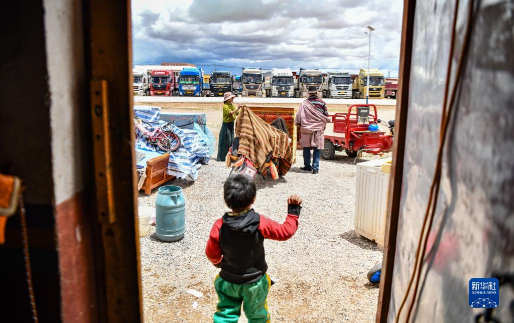 在双湖县多玛乡仲鲁玛村,运输家具的货车整装待发(7月13日摄,无人机照片)。新华社记者 晋美多吉 摄