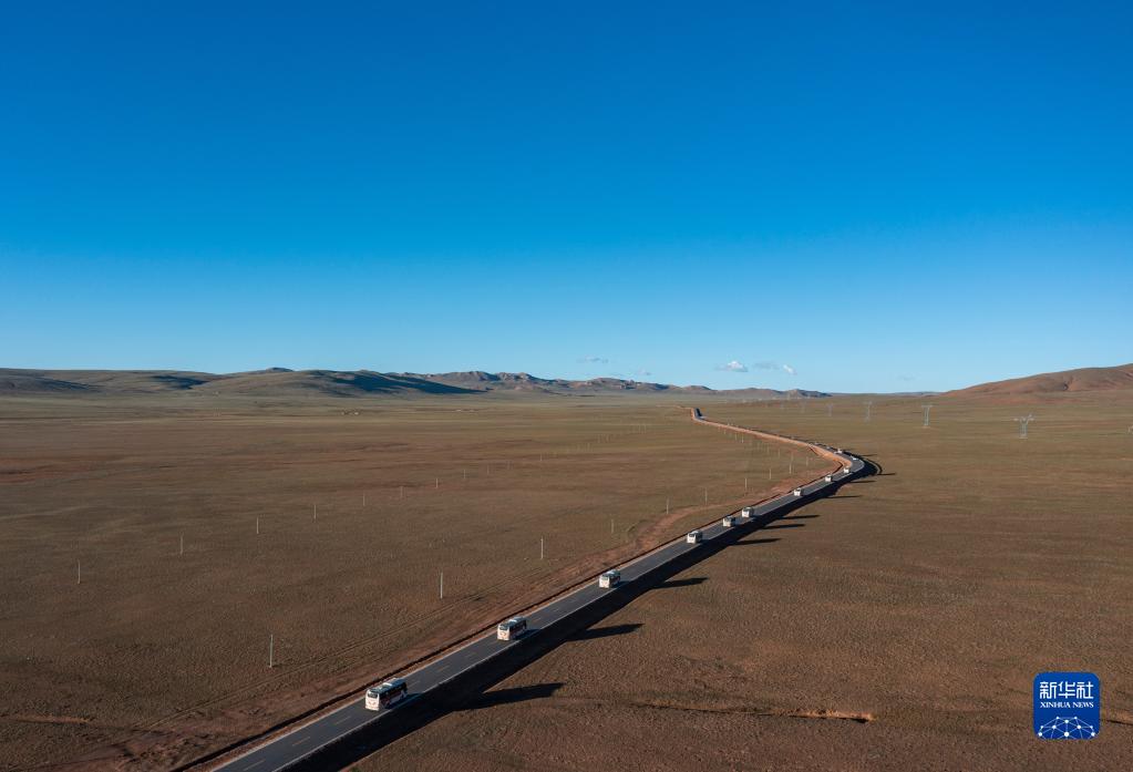 从双湖县出发的车队行驶在前往森布日安置点的道路上(7月19日摄,无人机照片)。新华社记者 孙非 摄