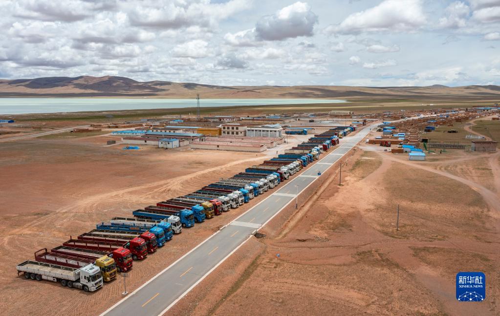 运输家具的货车在双湖县多玛乡果根擦曲村集合(7月12日摄,无人机照片)。新华社记者 晋美多吉 摄