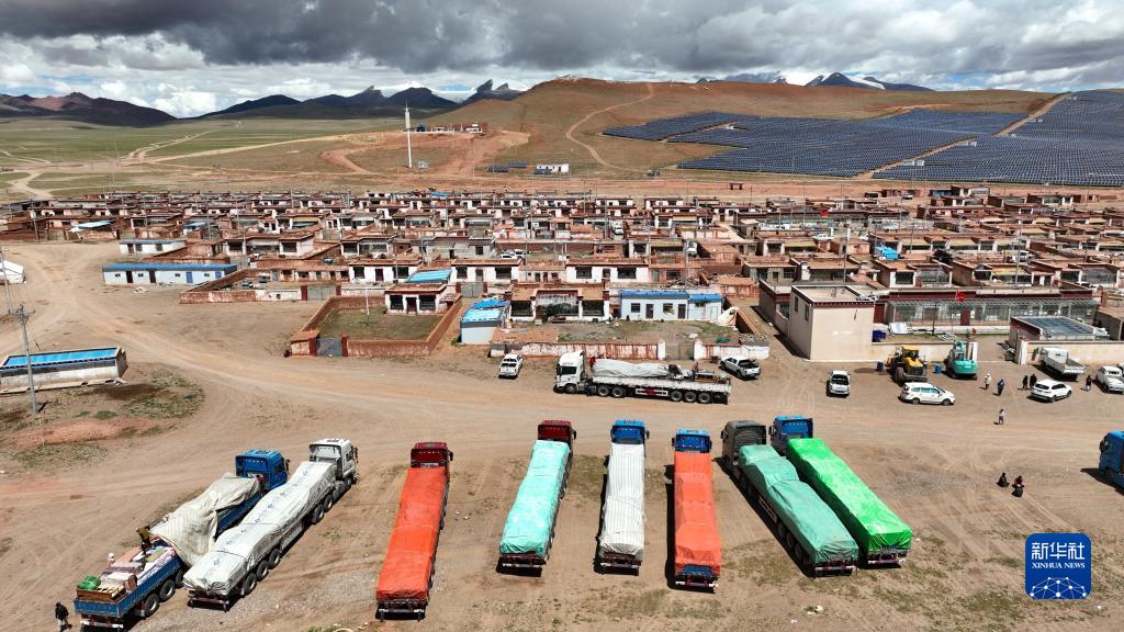 运输家具的货车在双湖县多玛乡果根擦曲村集合(7月12日摄,无人机照片)。新华社记者 孙非 摄