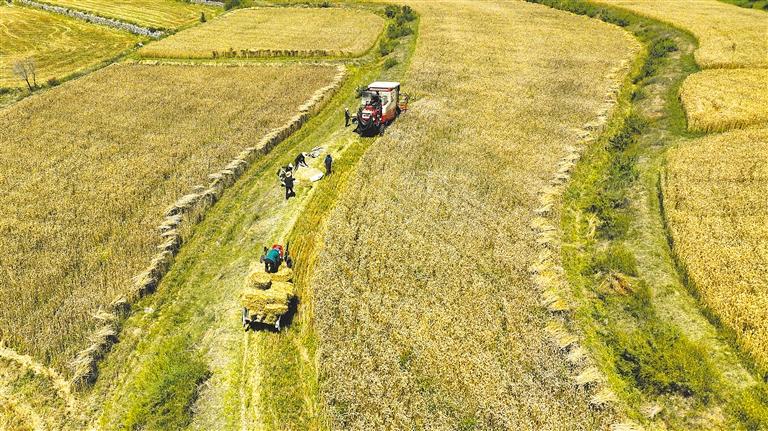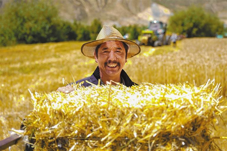 正值秋收时节,山南市扎囊县桑普村麦田里一片繁忙的景象,轰隆的机收声犹如一串欢快的音符,奏响了丰收的乐章。“现在有了机械非常方便,你看,一眨眼的功夫这块地就收完了。”村民白珍指着眼前的麦田说道。近年来,乡亲们靠着党的支农惠农政策,不断提升农业机械化水平,收割效率极大提升。