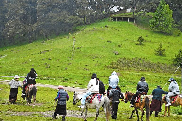 图为游客在鲁朗体验骑马。 记者 张猛 摄