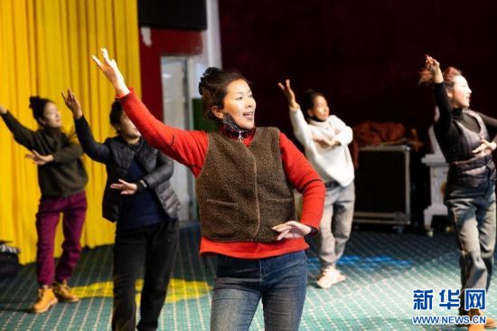 图为扎西曲登社区雅砻扎西雪巴藏戏队(社区文艺演出队)正在为2月5日的第三届扎西曲登村晚排练节目(1月31日摄)。新华网发 李腾 摄