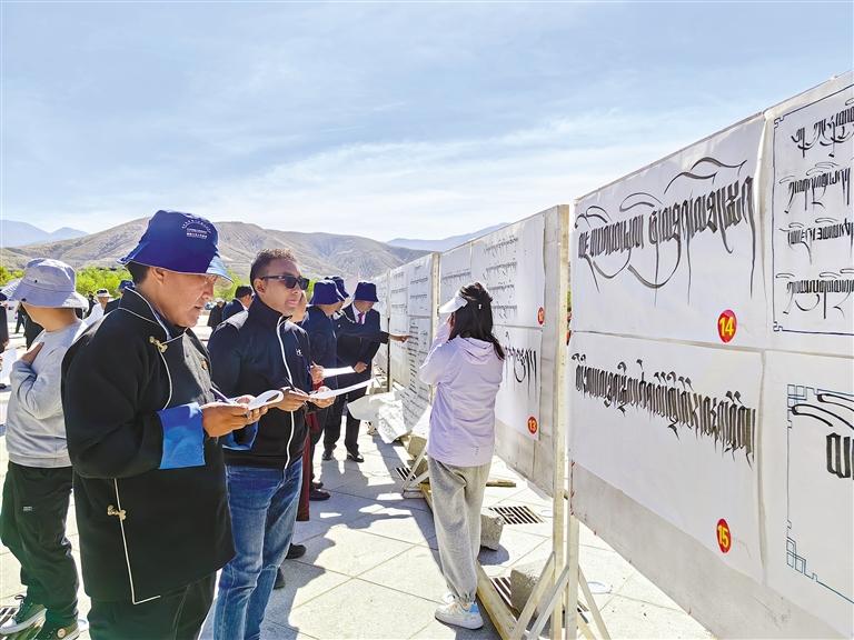 图为在谢通门县开展的书法、绘画、摄影比赛中,评委在为作品打分。