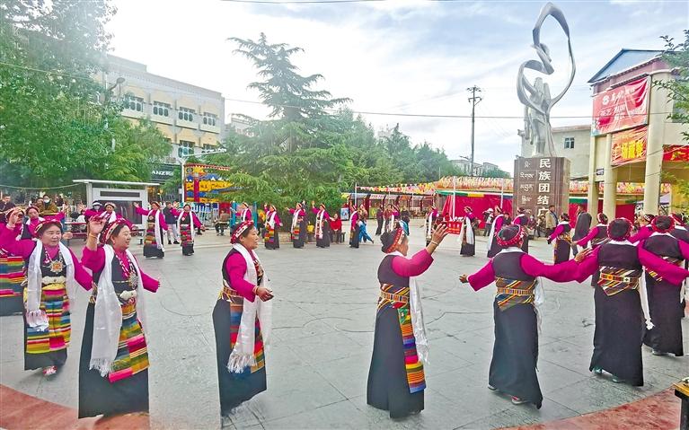 图为傍晚时分,日喀则市各族干部群众在民族团结广场跳锅庄。