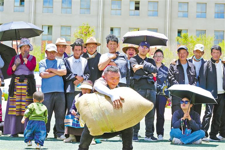 图为桑珠孜区城北街道举办庆祝第八个“日喀则市民族团结进步日”暨“全民来健身 健康你我他”社区运动会。这是参赛选手在进行抱石头比赛。