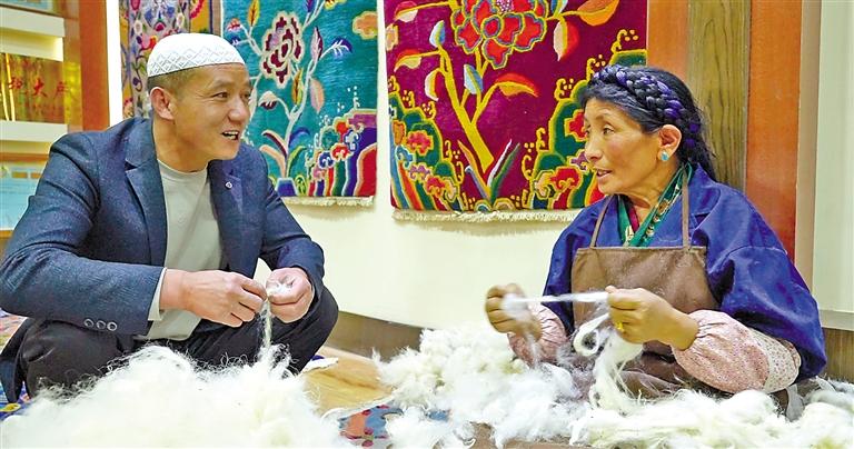 图为江孜县组织开展民族文化、民族手工业、民族饮食、民族服装等沉浸式体验活动。这是回族群众在体验传统服装制作工序。