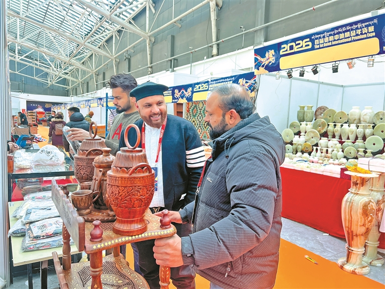 图为年货展上,外国商人正在摆放商品。记者 央金 摄