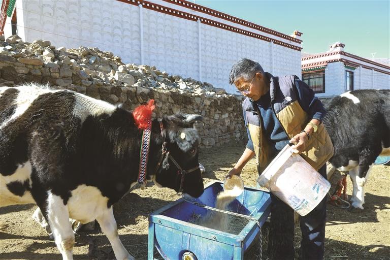 挡桑给奶牛喂食。通讯员 洛克 摄