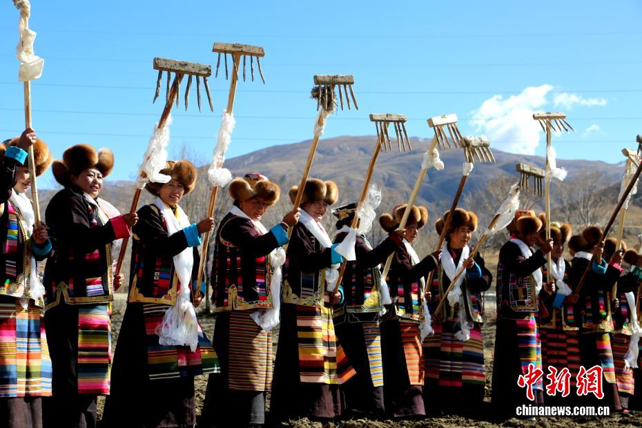 3月16日,西藏山南市琼结县琼结镇白日社区举行一年一度的春耕祈福仪式。村民们身着盛装,手捧哈达、青稞酒齐聚田间。装点经幡与彩旗的拖拉机列队驶入耕地,妇女们紧随播种。互敬青稞酒、抛洒糌粑等传统习俗一应俱全,古老农耕传统与现代农机作业相融,村民祈愿风调雨顺、五谷丰登。图为白日社区妇女们正在准备翻耕。