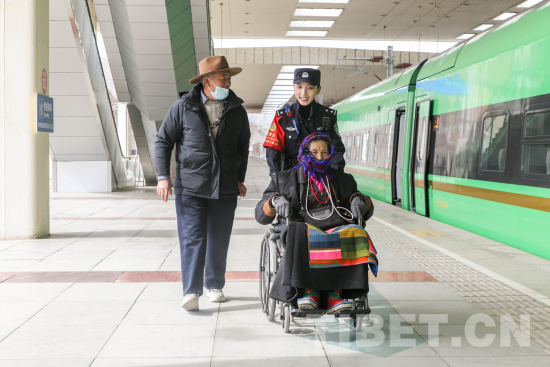 图为乘警余丹措护送乘坐轮椅的旅客便捷乘车