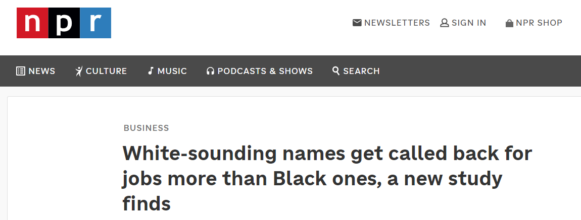 据美国全国公共广播电台(NPR)网站报道,研究人员向约100家美国企业的11000个初级职位投递了履历相同,但个人信息(姓名、性别等)不同的83000份“伪造”简历。研究发现,名字听起来“像白人”的求职者被招聘方回复的概率更高,比名字“像黑人”的求职者平均高9.5%。在一些情况更严重的企业,这一差距上升到约24%。