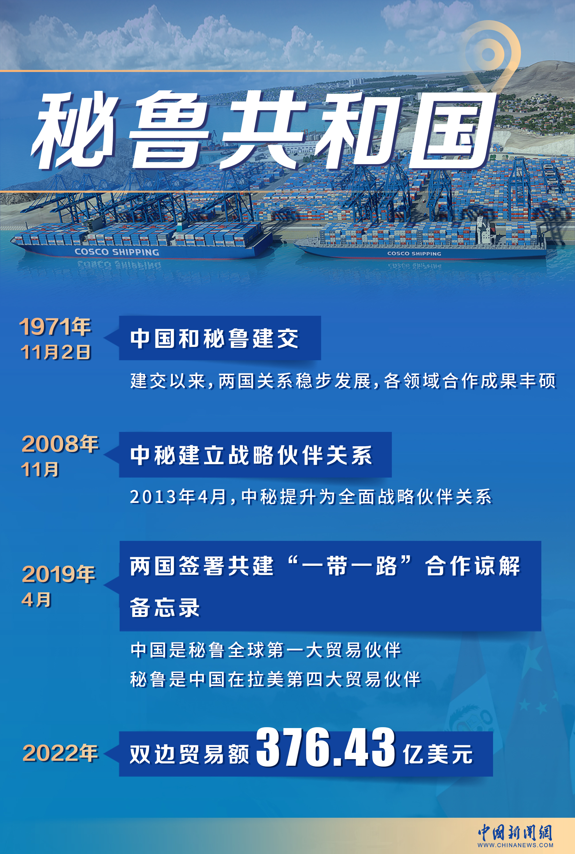 2022年,中秘双边贸易额达376.43亿美元,目前,中国是秘鲁全球第一大贸易伙伴、第一大出口市场和第一大进口来源国,秘鲁也是中国在拉美第四大贸易伙伴。