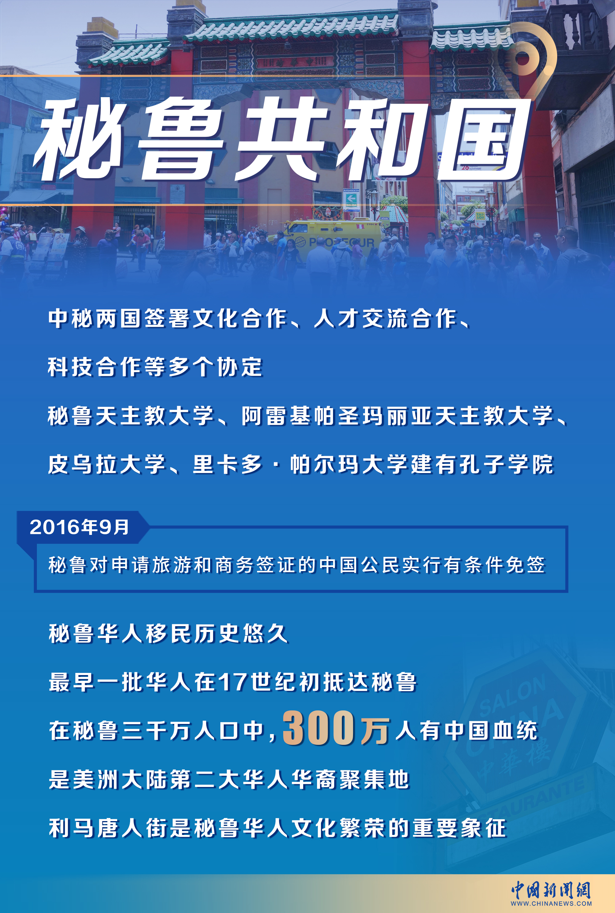 值得一提的是,秘鲁是美洲华人移民历史最悠久的国家之一。早在17世纪初,便已有华人抵达秘鲁首都利马。在秘鲁的三千万人口中,有三百万人有着中国血统,是美洲大陆仅次于美国的第二大华人与华裔聚集地。