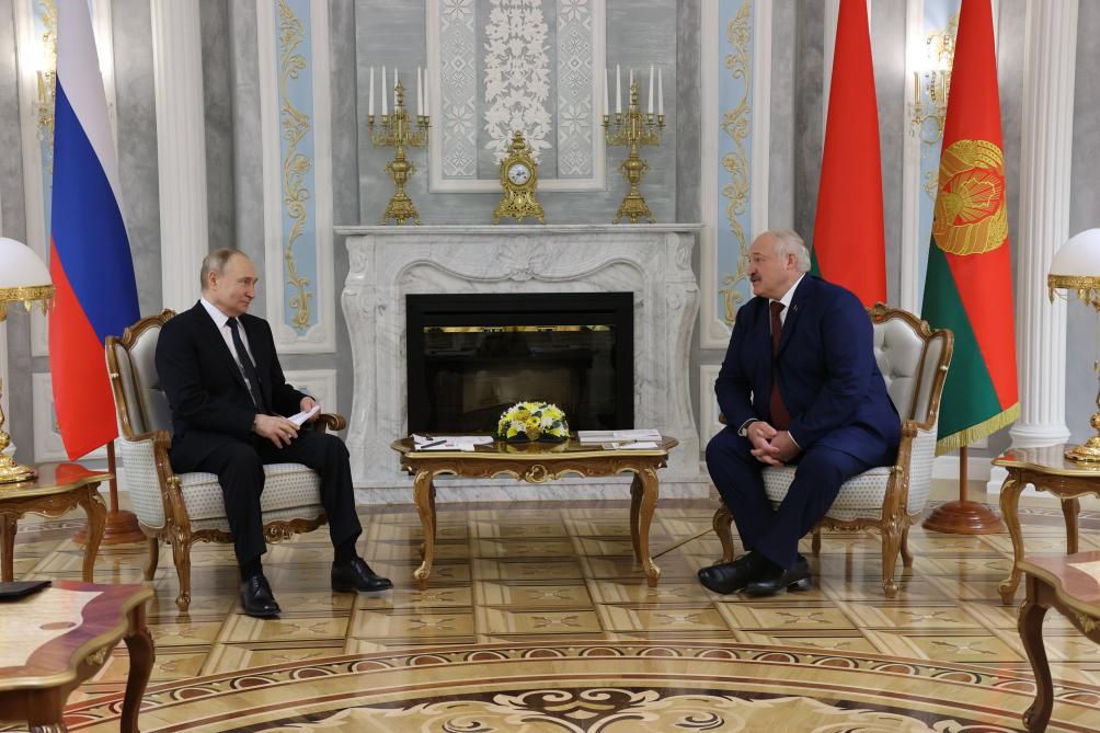 5月24日,俄罗斯总统普京(左)与白俄罗斯总统卢卡申科在白俄罗斯首都明斯克举行会谈。新华社发(白俄罗斯总统网站供图)