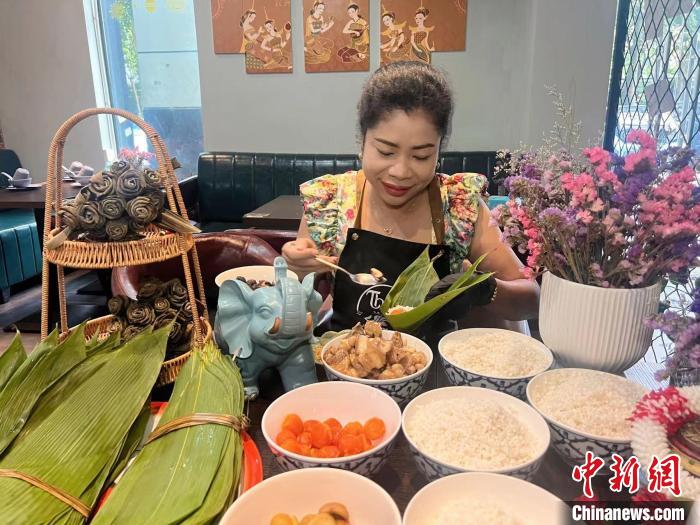 正值端午节,欧春菊位于广西南宁的泰式私房菜馆宾客盈门,她制作的泰国风味粽子、冬阴功汤、菠萝炒饭、青木瓜沙拉等美食,为当地民众的端午餐桌增添了异域风味。