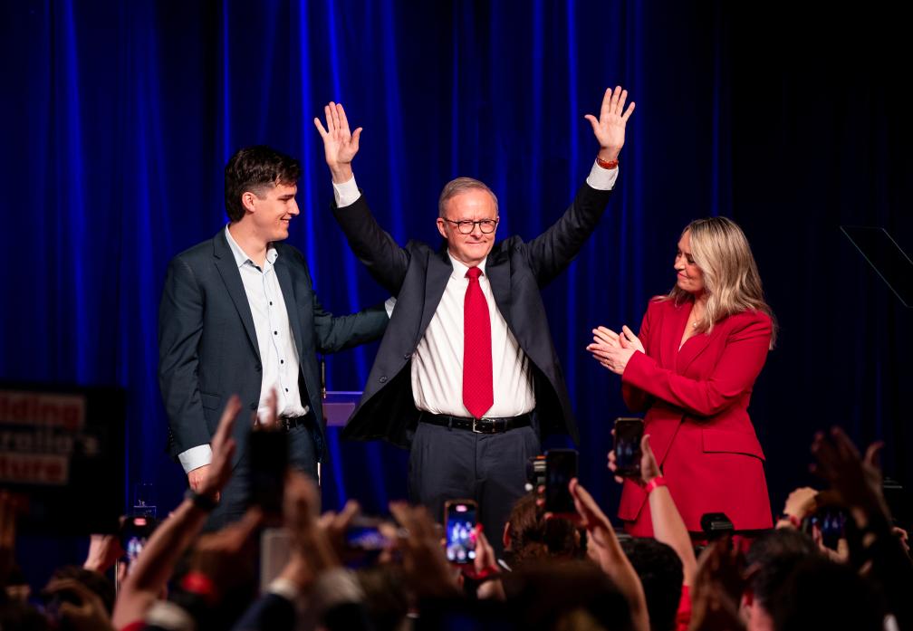 5月3日,在澳大利亚悉尼,澳大利亚总理阿尔巴尼斯(中)在竞选集会上庆祝胜利。新华社记者马平摄
