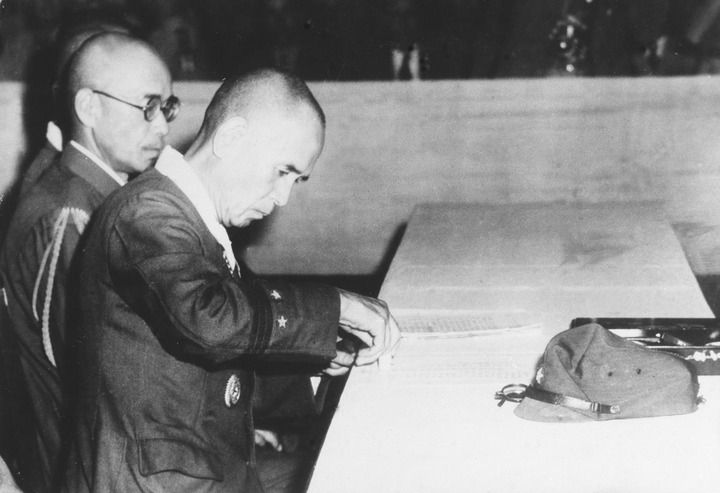 1945年9月9日,南京举行中国战区日军投降仪式,侵华日军总司令冈村宁次代表日军签署投降书。新华社发