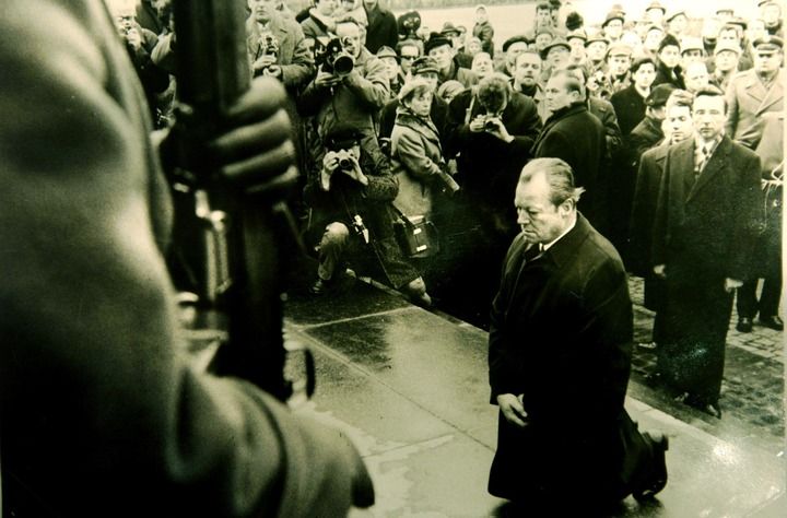 1970年12月7日,联邦德国总理勃兰特在波兰首都华沙犹太人殉难纪念碑前下跪。新华社发