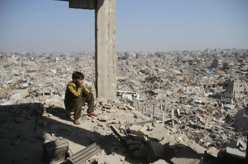 2025年1月29日,在加沙地带杰巴利耶难民营,一名巴勒斯坦少年望向废墟。新华社发(阿卜杜勒拉赫曼·萨拉马摄)