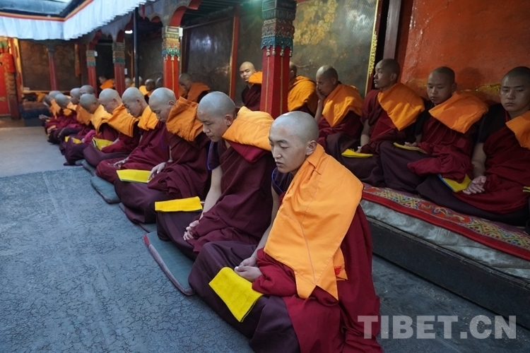 当天清晨,扎什伦布寺桑烟缭绕、法号声声,28 位受戒的年轻僧人带着新制袈裟,迎着朝霞依次走向拉让殿等待班禅授戒这一神圣时刻的到来。8时许,在手持黄伞、香炉和吹唢呐的高僧护送引领下班禅缓缓步入拉让殿,并与在场僧众集体诵经。诵经仪式结束后,班禅就坐于拉让殿宝座,4名高僧大德作为授戒众,开始为僧人闭门授戒、剃度、赐法名、摸顶。此时,受戒僧人一一入座,两手在胸前交叉,听班禅引证经典告诫,并宣誓严守戒律。
