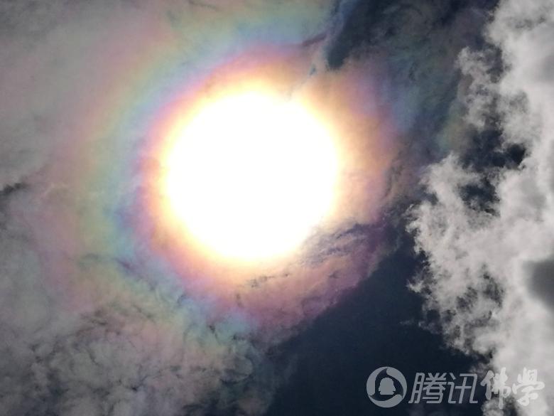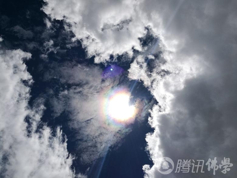法会举行的第二天,也就是22日下午15时左右,德庆格桑颇彰上空突现五彩日轮。