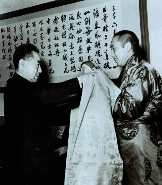 图为十世班禅额尔德尼向周总理敬献哈达。摄影:金持元