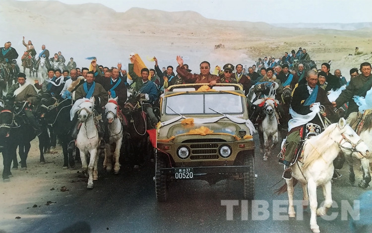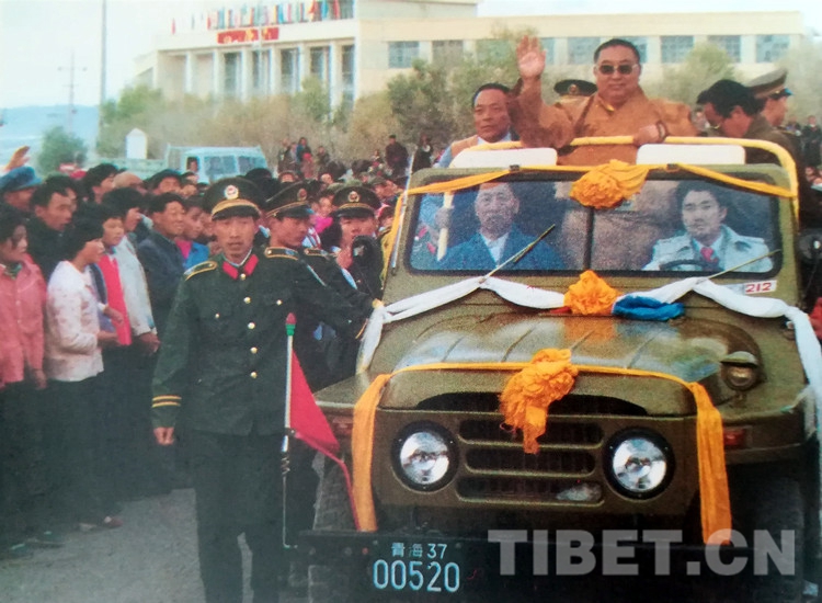 当十世班禅大师在原青海省人大常委会副主任夏茸尕布、原海南州委书记东主加的陪同下,乘敞篷车从幸福滩来到海南州州府所在地恰卜恰镇时,各族人民群众身着节日盛装,载歌载舞,热烈欢迎十世班禅大师。十世班禅神采奕奕,精神饱满,高兴地向各族群众招手致意。