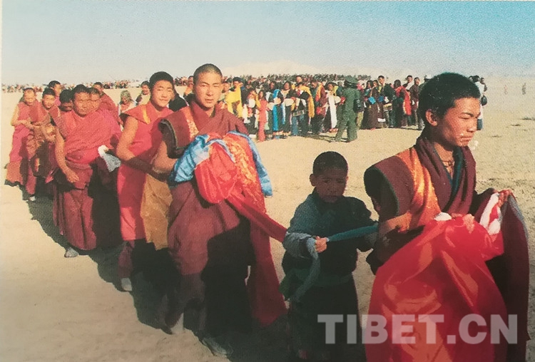 图为十世班禅大师在幸福滩上诵经祈祷,祝愿海南州昌隆、繁荣,各族人民幸福、吉祥。