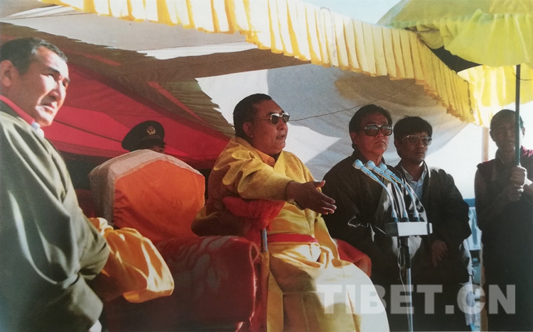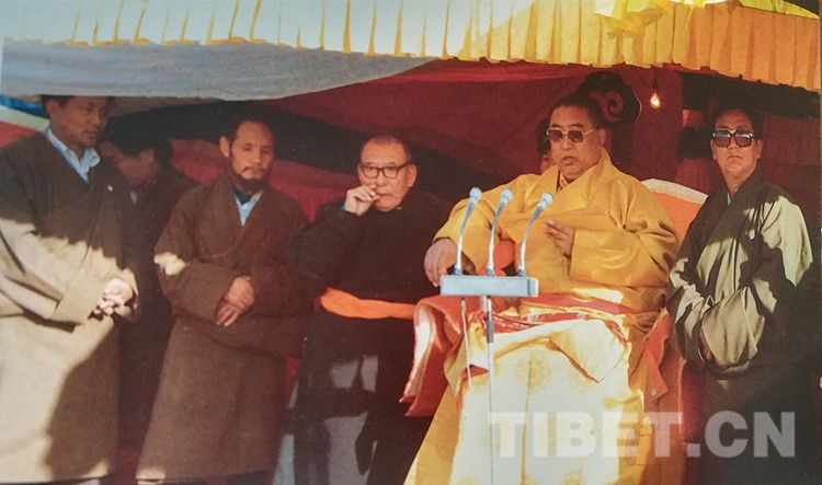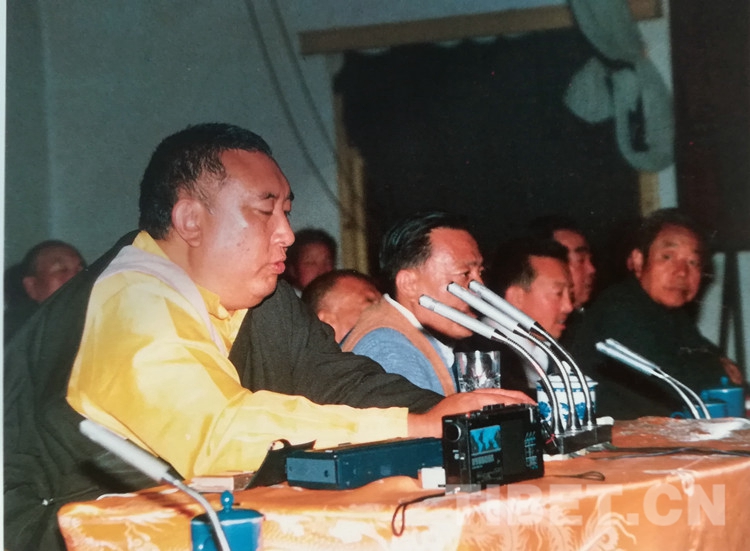 图为十世班禅大师向海南州各族人民传达党和政府的亲切慰问,宣传党的民族政策和宗教政策。