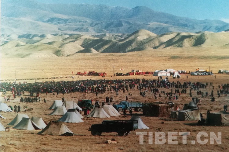图为渴盼得到十世班禅大师摩顶的群众比肩接踵,汇聚草场,恭候那一幸福的时刻。
