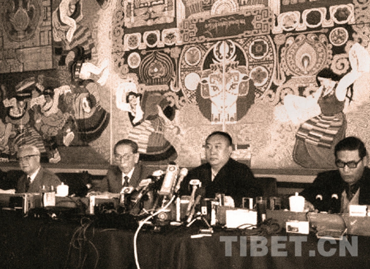 图为十世班禅大师(左三)坐在人民大会堂西藏厅壁画《扎西德勒图》前。