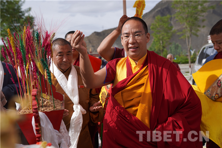 图为十一世班禅抵达后抛洒青稞 摄影:王淑