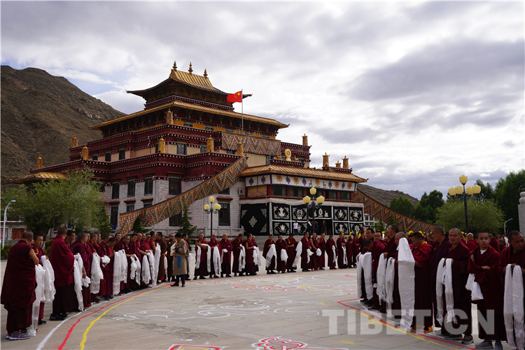 当日殊胜而美好,西藏佛学院门口的石板地上,用黄白两种细粉绘制了巨大的吉祥八宝图案,全院僧尼学员列队道路两旁,手持哈达或藏香,静静等待全国政协常委、中国佛教协会副会长班禅额尔德尼•确吉杰布到来。