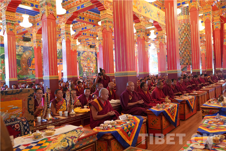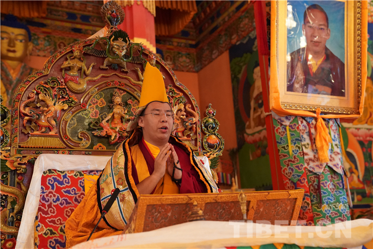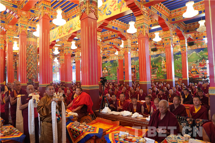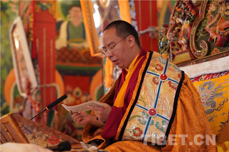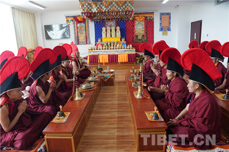 领经师带领全体僧尼诵经数分钟。随后,十一世班禅用洪亮的声音诵经祈福,讲经授法。诵经结束后,十一世班禅用简短真诚的话语勉励全院僧尼。