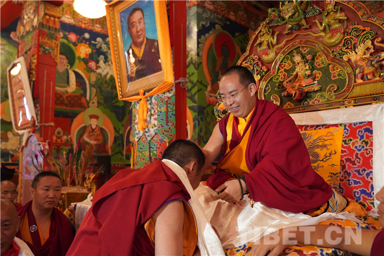 图为十一世班禅为僧众摸顶赐福 摄影:王淑