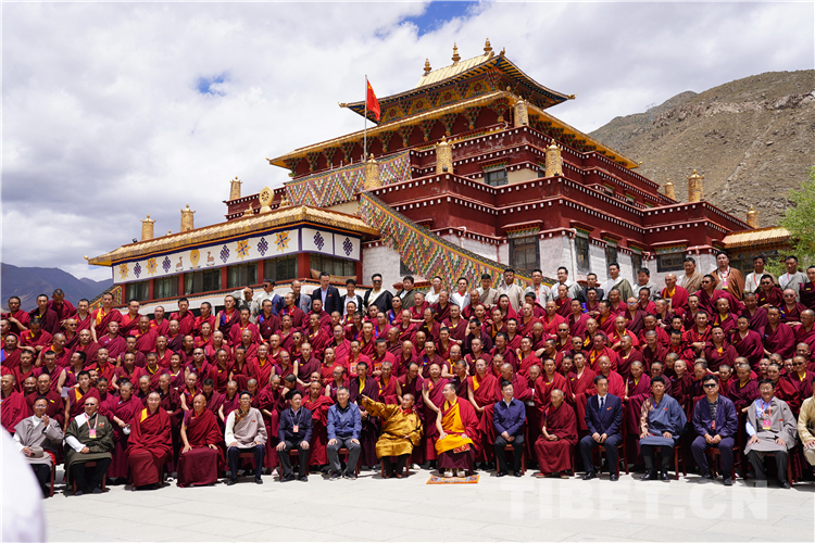 随后,十一世班禅为全院僧尼摸顶赐福,并与全院僧尼合影留念。