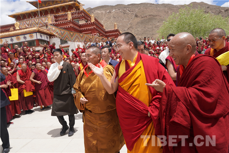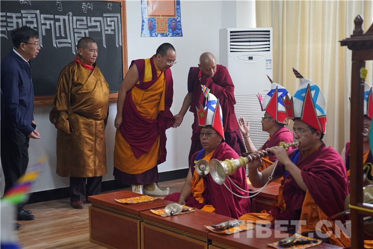 十一世班禅还分别来到格鲁教室、萨迦教室、噶举教室、宁玛教室看望正在学习的各大教派高僧、学员。随后,十一世班禅来到辩经场,观摩西藏佛学院学员辩经。